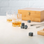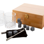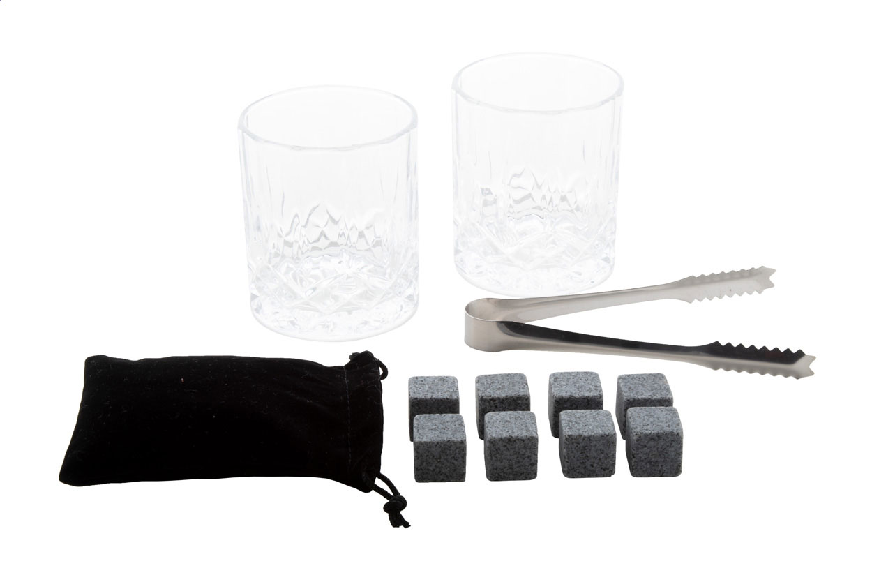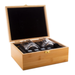 Kvaliteetne ja luksuslik viskikomplekt, mis on pakitud elegantsesse bambusest kinkekarpi. Komplekt sisaldab kahte 250 ml viskiklaasi, 8 korduvkasutatavat kivist jääkuubikut hoiukotiga ning roostevabast terasest tangisid. Täiuslik kingitus viskisõpradele, äripartneritele või erilisteks sündmusteks.